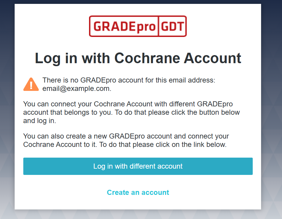 You can either create a GRADEpro account if you don't have one (as described in the first section of this article), or log in with a GRADEpro account if you have one already, thus connecting GRADEpro and Cochrane accounts.