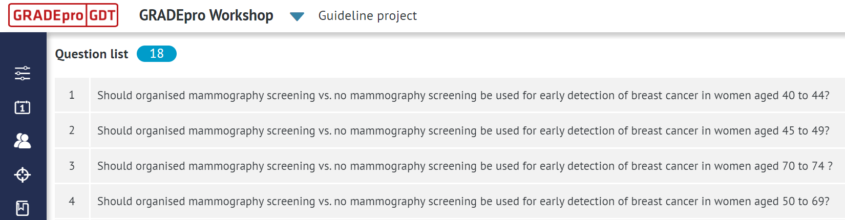 GRADEpro also facilitates the initial stages of guideline development. Using the Questions generation module, you can compose the list of relevant PICO questions in collaboration with your Panel Members.