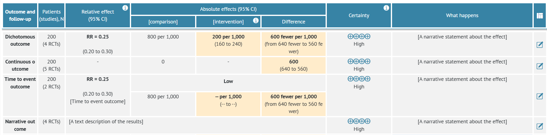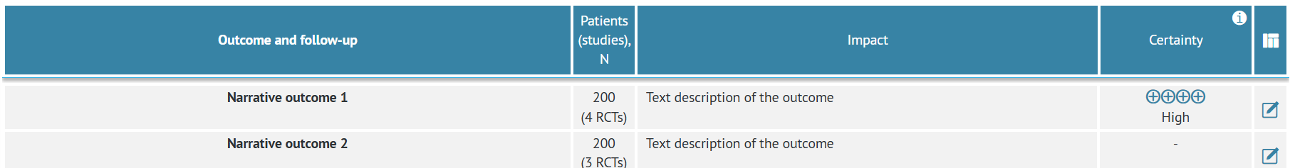 Additionally, all of the management tables (with the exception of Interactive SoF) can be presented in narrative mode if all outcomes within the table are narrative outcomes. Examples of narrative tables are also presented below. When in narrative mode, some elements of the header of the table related to the numerical data, e.g. the relative effect column, are removed since no such data are presented for narrative outcomes.